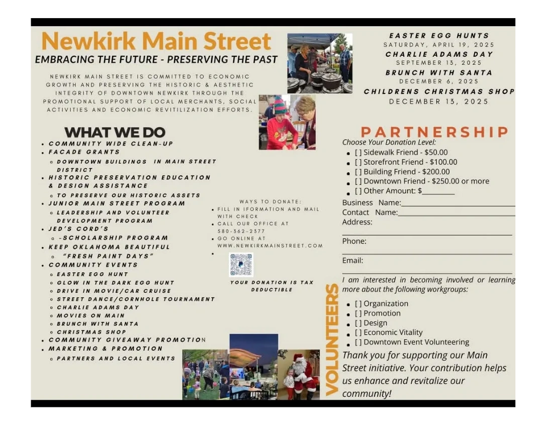 Newkirk Main Street is a nonprofit organization dedicated to supporting and empowering our community through various programs and initiatives. Our mission is to make a positive impact and create a better future for all.